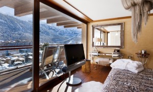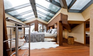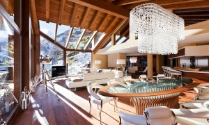 The stunning open plan living and dining area provides a luxurious and spacious area for your whole party to relax after a day on the slopes. Floor to ceiling windows, a double height exposed timber ceiling and extensive balcony and terrace make the most of the fabulous views. An Ergonomicc De Sede moving sofa allows guests to take advantage of all aspects of the living room and the dining area features a spacious table to seat up to 12 guests, completed with a stunning handmade Murano crystal chandelier.